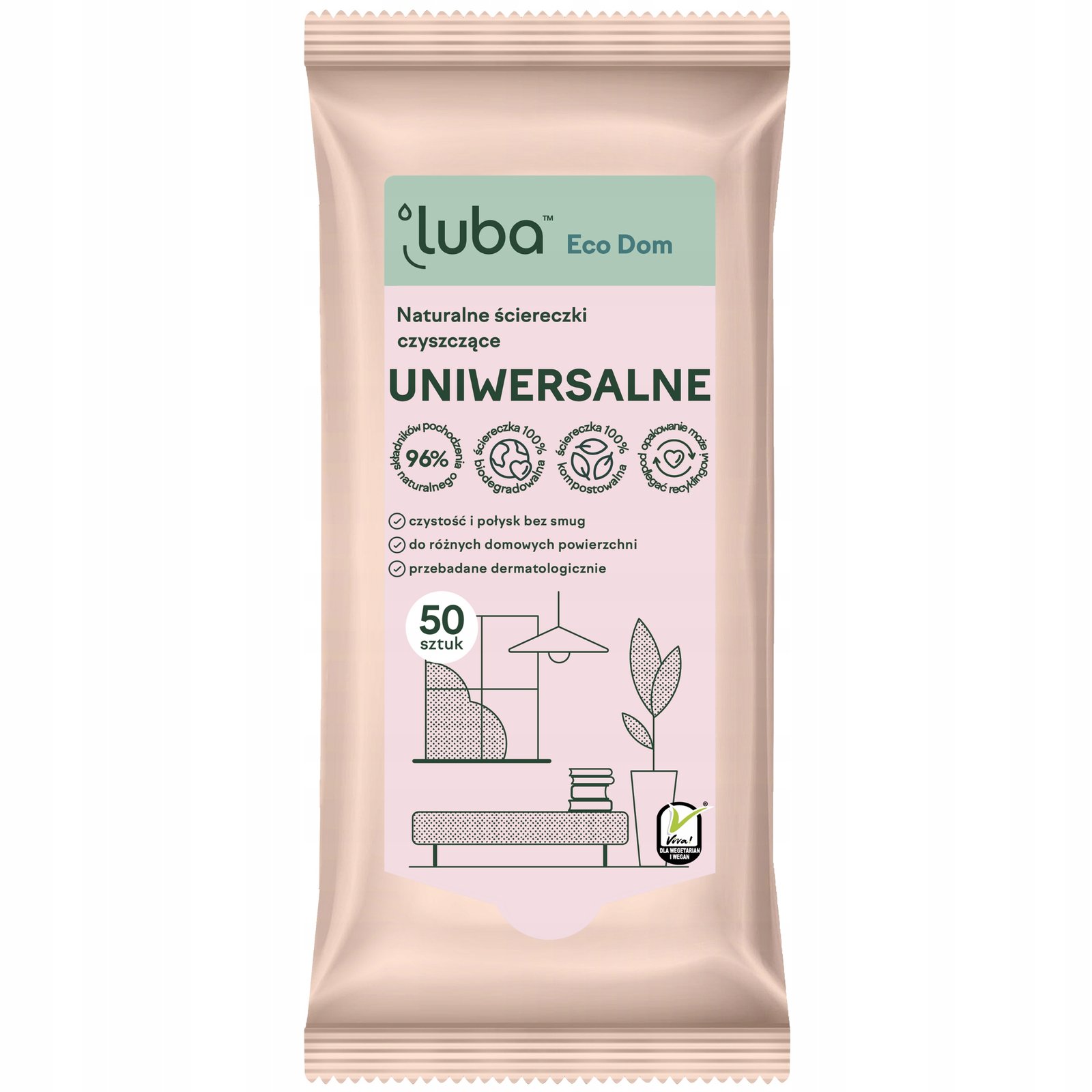 Dabīgas, mitrinātas tīrīšanas salvetes Luba Eco Dom ir lielisks veids, kā uzturēt kārtību vannas istabā. Tās atjauno tīrību, spīdumu un mirdzumu keramikai, furnitūrai un flīzēm, kā arī noņem ziepju un ūdens nosēdumus. Tās neitralizē nepatīkamas smakas, pēc lietošanas atstājot ilgstošu, maigu atsvaidzinošu aromātu. Dermatoloģiski pārbaudītas, draudzīgas roku ādai. Salvetes ir 100% bioloģiski noārdāmas un kompostējamas. Formula sastāv no 96% dabīgām sastāvdaļām. Iepakojumu var pārstrādāt.