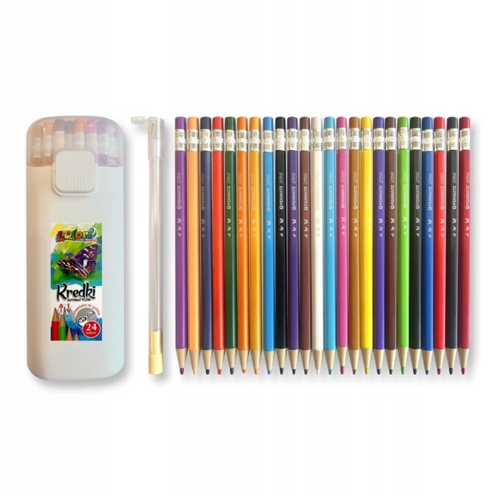 24 krāsaino zīmuļu komplekts ar 2,5 mm biezu grafītu, kas automātiski izkrīt no korpusa, nospiežot pogu. Komplektā ietilpst mini zīmuļu asināmais. Viss iepakots praktiskā tūbiņā, lai pasargātu saturu no bojājumiem.