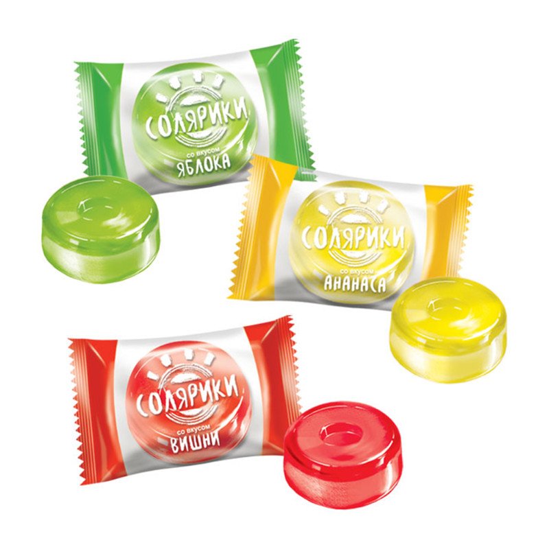 Aromātisko ābolu, ananāsu un nogatavojušos ķiršu konfektes trio modernā iesaiņojumā.