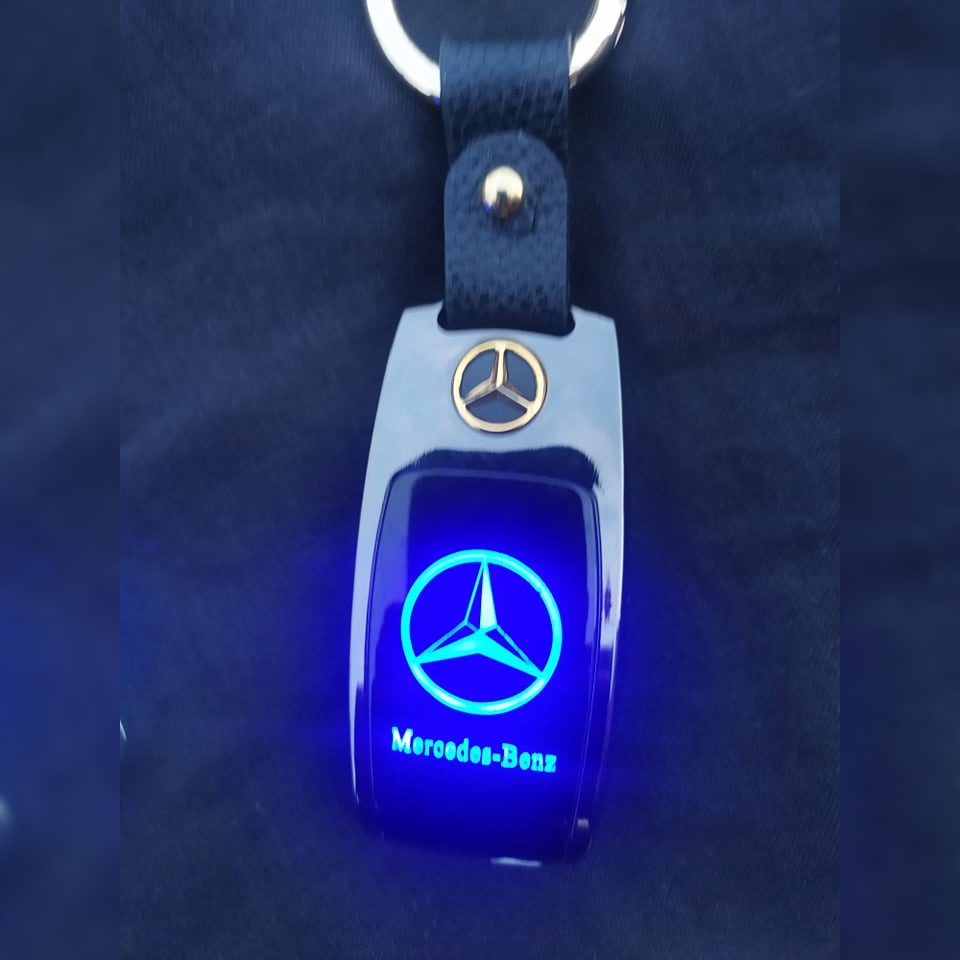 Atslēgu piekariņš ar iebūvētu šķiltavu, lukturīti un apgaismotu automašīnas zīmola logotipu.