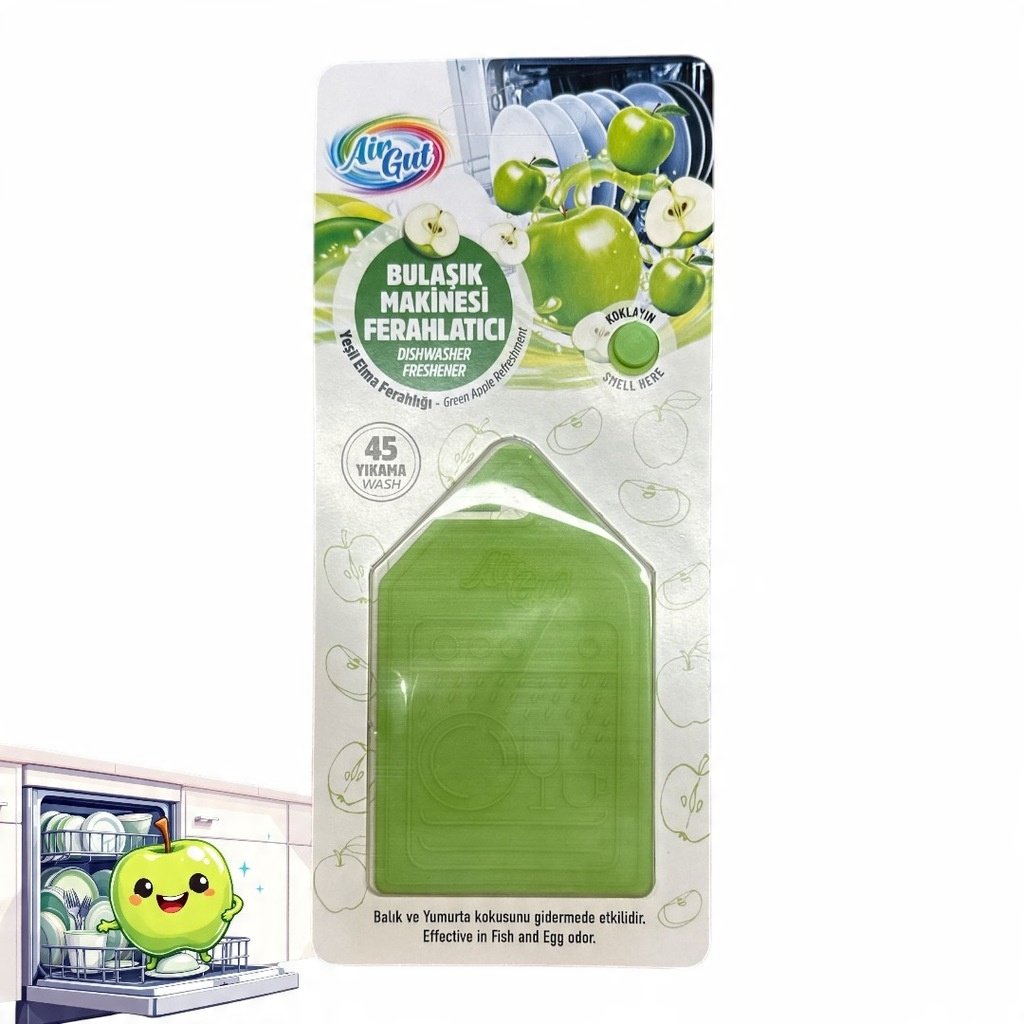Atjauno traukus ar sulīga, zaļa ābola svaigumu! Air Gut ir ērts trauku mazgājamās mašīnas aromāts, kas nodrošina patīkamu aromātu visā virtuvē 45 mazgāšanas reižu garumā un atstāj uz traukiem maigu svaiguma noti. Viegli lietojams — vienkārši pakariniet to uz trauku mazgājamās mašīnas groza un izbaudiet efektu!