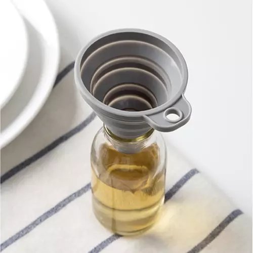 SPECIFIKĀCIJA - pelēka krāsa; materiāls: silikons; salokāms: jā; pakarināšanas iespēja: jā; izmēri: 7x8cm; ieplūdes diametrs: 6,5 cm; snīpi diametrs: 1,1cm; svars: 0,02 kg; svars iepakojumā: 0,026 kg.