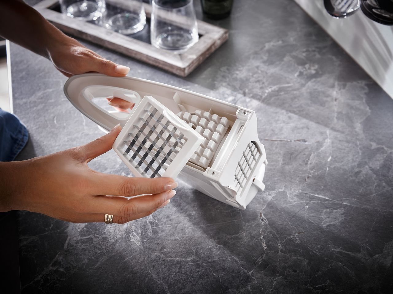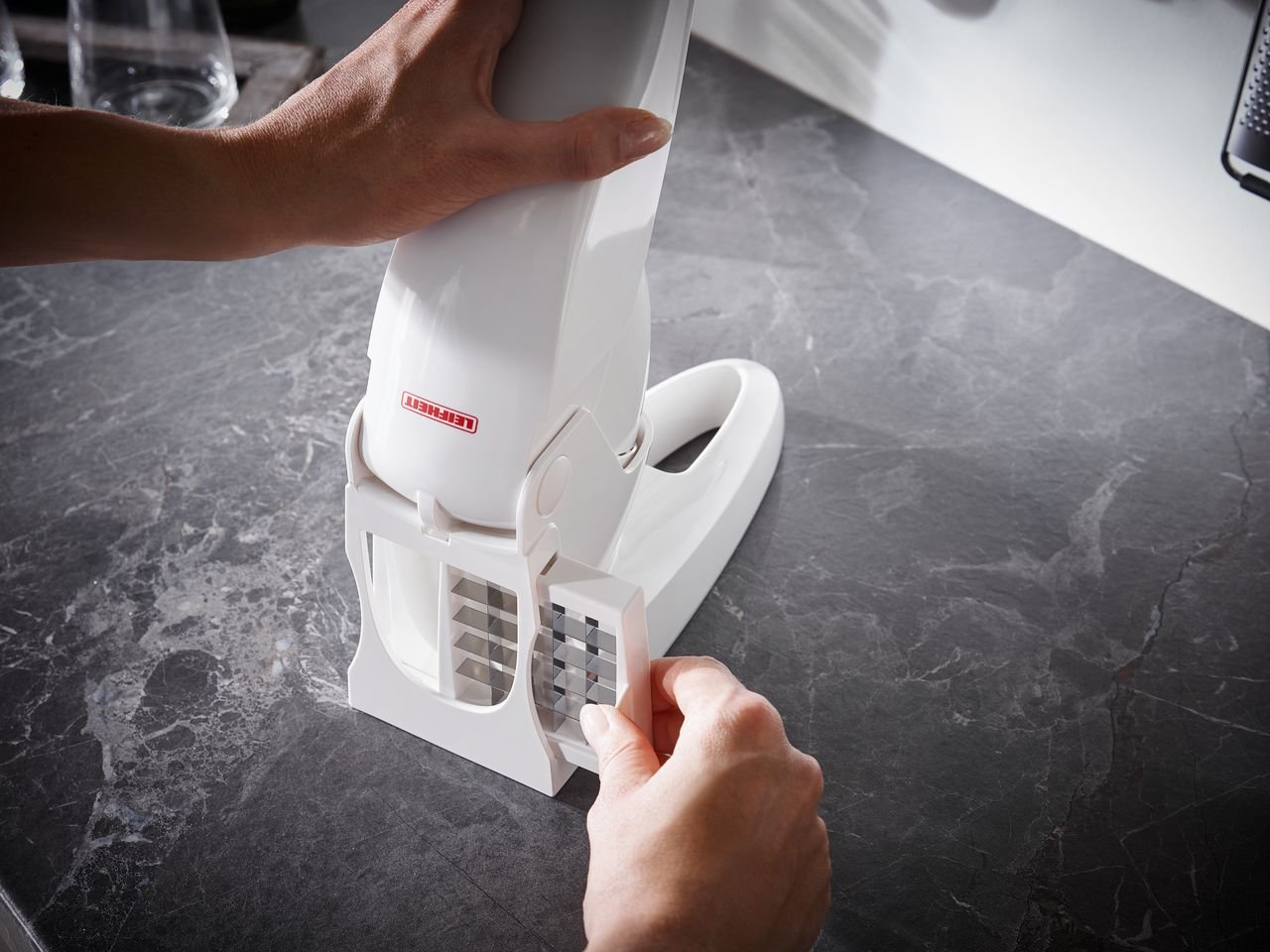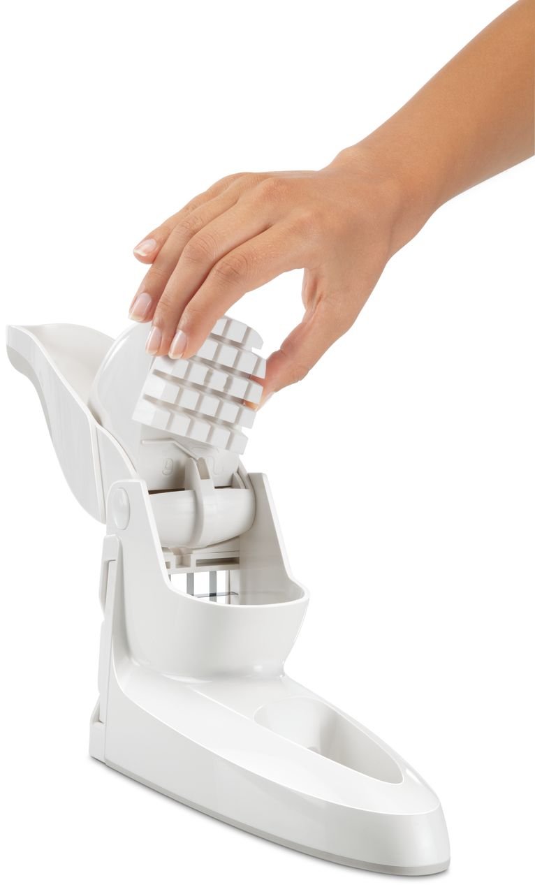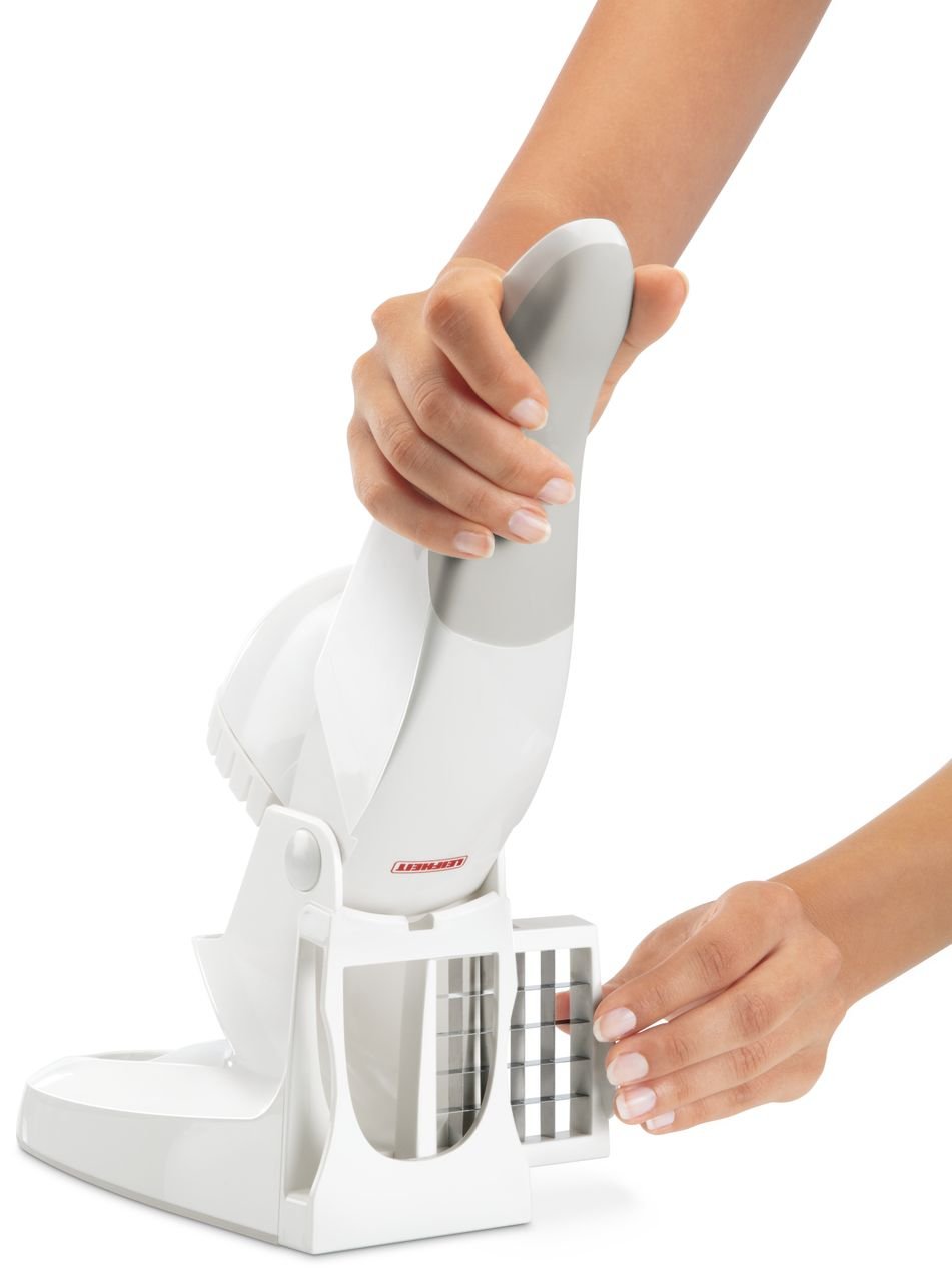 Paredzēs vieglai kartupeļu frī un veselīgu dārzeņu pagatavošanai. Kartupeļus un dārzeņus viegli sagriezt gabaliņos ar divu dažādu izmēru asmeņiem. Ar vienu roktura spiedienu tiek izveidoti daudzi gabaliņi 10mm un 12mm platumā. Neslīdošs rokturis padara griešanu vēl ērtāku. Neslīdošs pamatnes pārklājums novērš ierīces slīdēšanu griešanas laikā.
