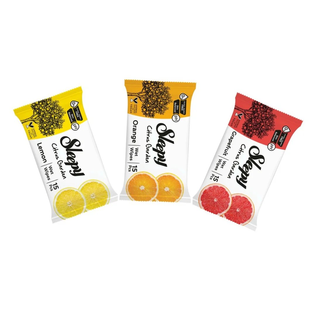Šajā komplektā ir 3 dažādi svaigu augļu aromātu (greipfrūts, citrons un apelsīns) salvešu iepakojumi, katrā 15 gab.