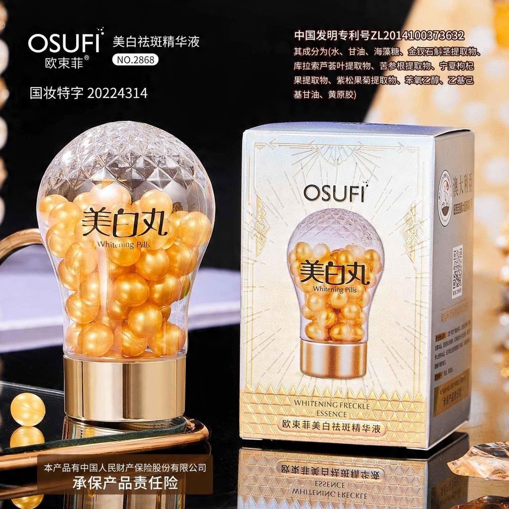 Profesionāla kopšana ādai ar krāsotiem plankumiem - OSUFI Whitening Freckle Essence elegantu kapsulu veidā, kas satur koncentrētas aktīvās sastāvdaļas, kas atbalsta pigmentācijas plankumu, vasarraibumu un aknes radīto krāsojumu balināšanu.