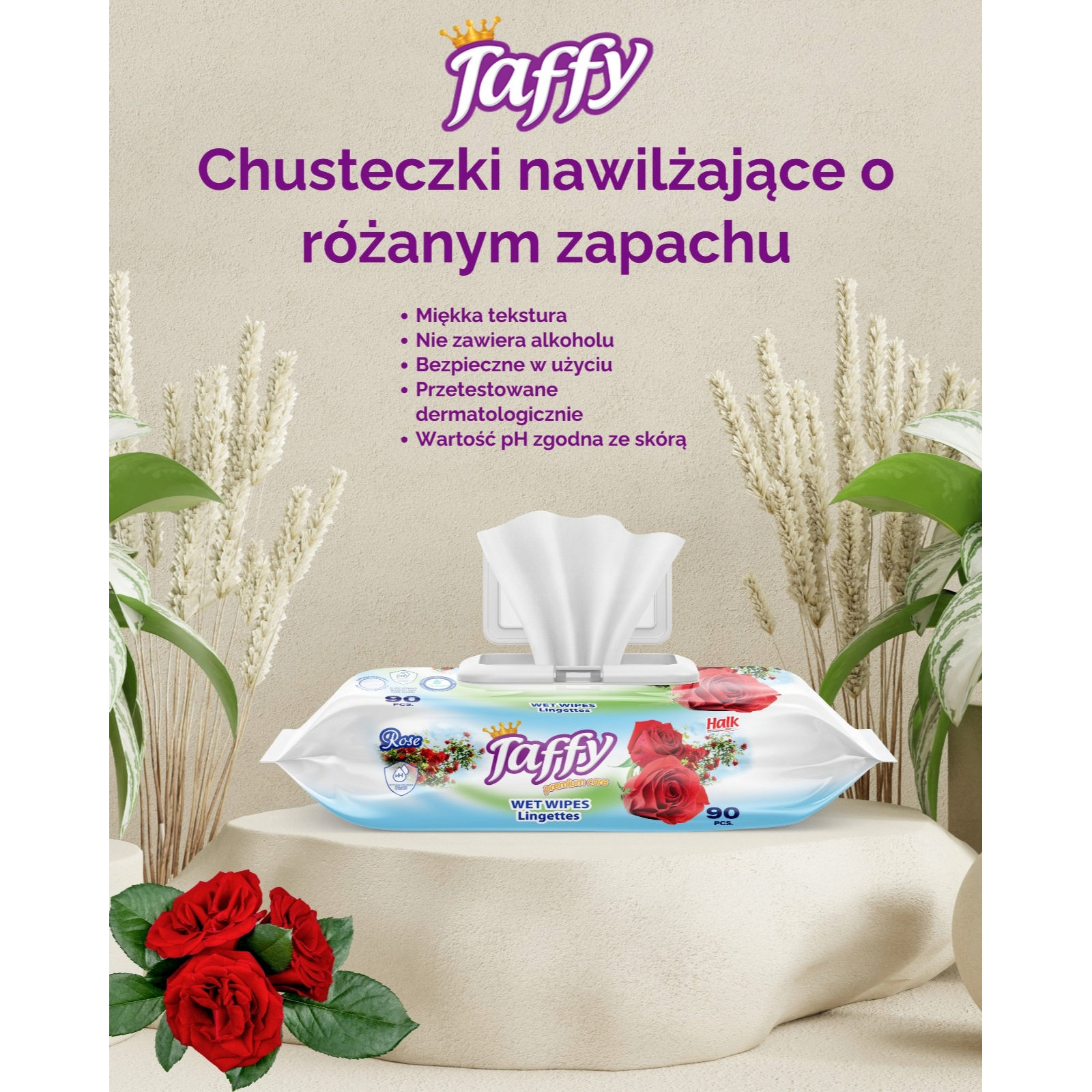 TAFFY mitrās salvetes ir maigs un efektīvs veids, kā attīrīt ādu, pateicoties to mīkstajai tekstūrai ar šūnveida slāni. Dermatoloģiski pārbaudītas, bezalkoholiskas, šīs salvetes sniedz patīkamu svaiguma un komforta sajūtu, un ir ideāli piemērotas visai ģimenei. Smalkais rožu aromāts atstāj ādu svaigu un smaržīgu.