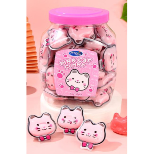 Katrs želejas konfektes gabaliņš ir atsevišķi iepakots plastmasas kastītē. Konfektes forma atgādina mīļu rozā kaķēnu.