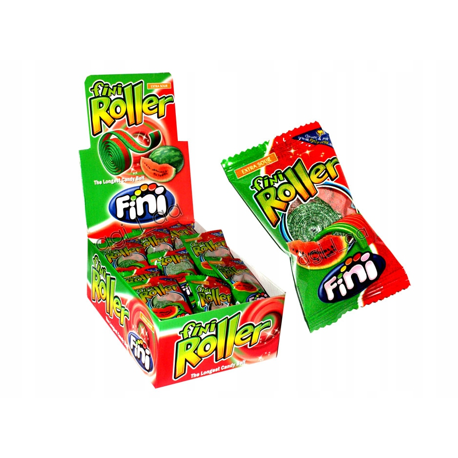 Arbūzu garšas želejkonfektes strēmelīšu formā, satītas rullītī.