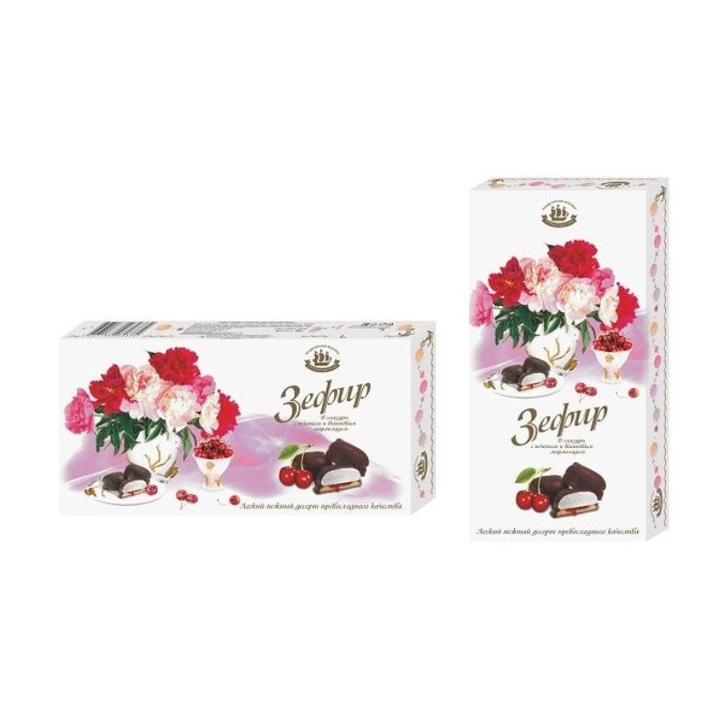 • Vaniljas zefīri, kas iepakoti cepumos ar ķiršu pildījumu šokolādes glazūrā.