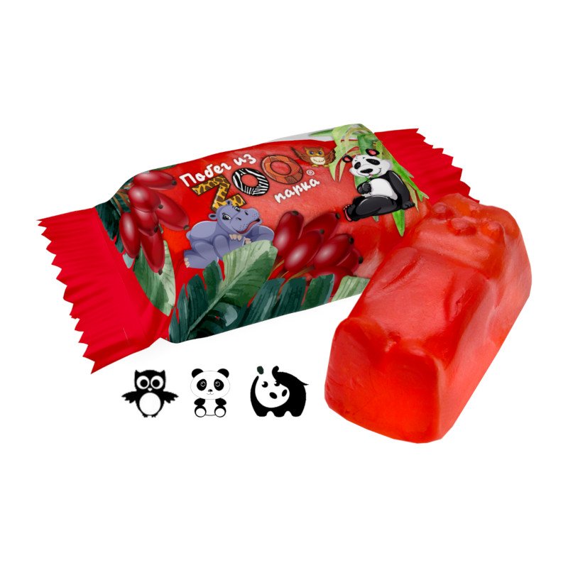 Konfektes nīlzirga, pandas, pūces formā: košļājamā marmelāde ar sulīgu želejas pildījumu ar bārbeles garšu.
