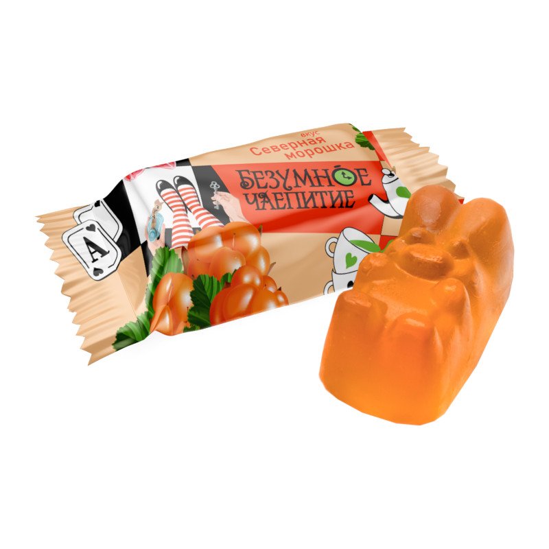 Konfektes Baltā truša no Brīnumzemes formā: košļājamā marmelāde ar sulīgu želejas pildījumu ar ziemeļu lāceņu garšu