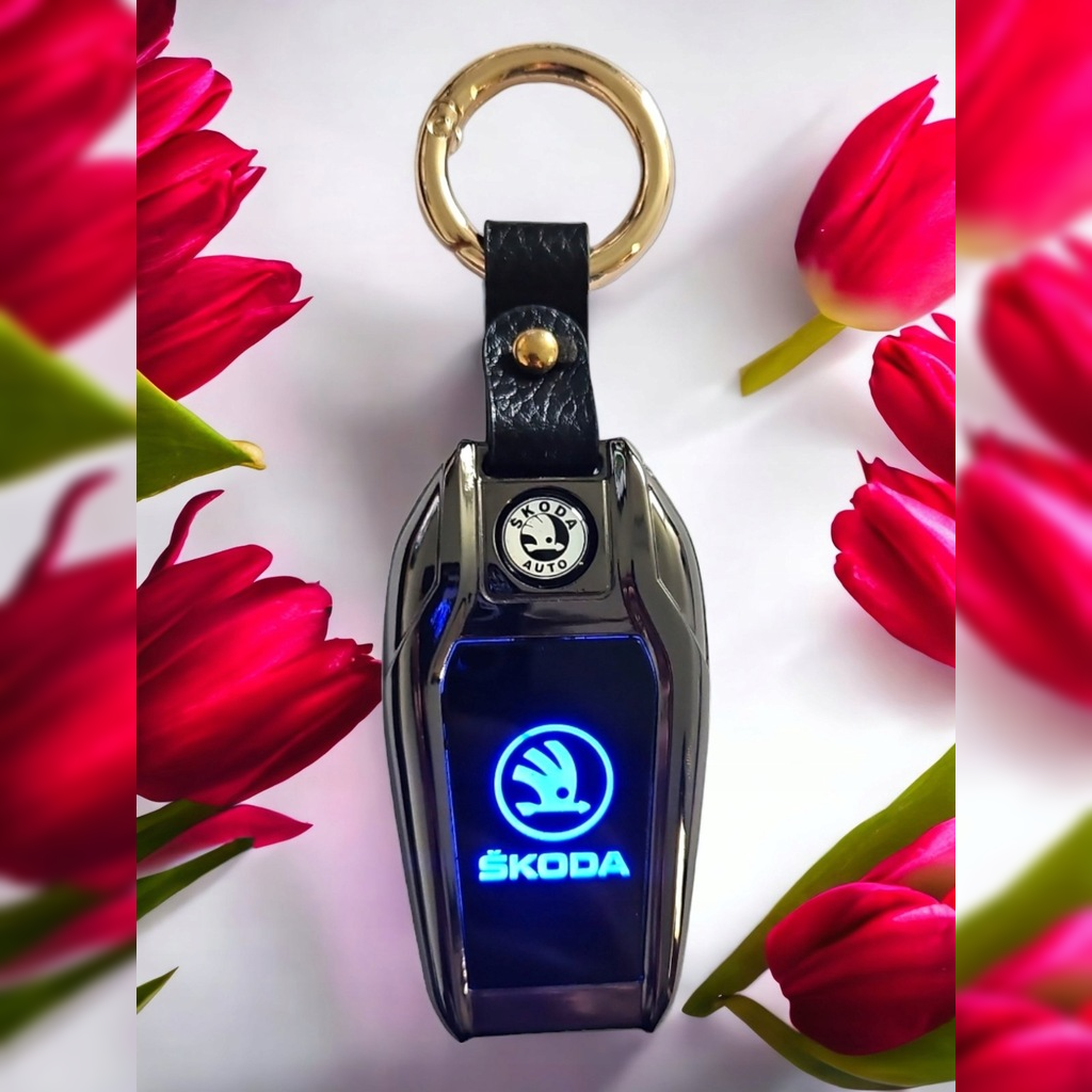 Atslēgu piekariņš ar iebūvētu šķiltavu, lukturīti un apgaismotu automašīnas zīmola logotipu.
