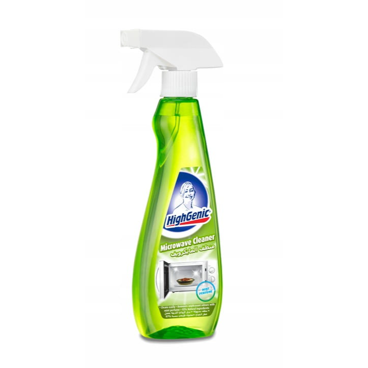 Piparmētru aromāta HighGenic® mikroviļņu krāsns tīrīšanas līdzeklis ar savu 97% dabīgo formulu nodrošina dabisku mikroviļņu krāsns iekšējo un ārējo virsmu, kā arī virtuves darba zonu tīrīšanu.